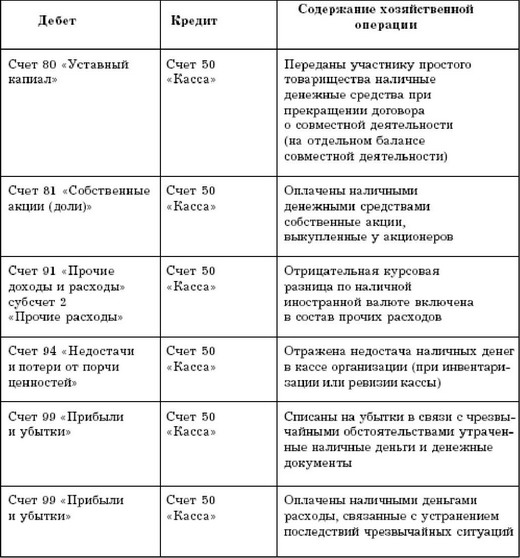 Типовые проводки по кредиту счета 50 (табл. 13).